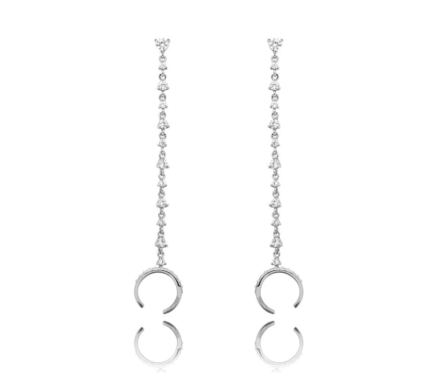 עגילים נופלים "לונה" - שני חורים עשויים כסף אמיתי 925 ומשובצים אבני זרקון עדינות לאורך העגיל המדמה שרשרת כוכבים המתארכת לכיוון הירח בלילה. שילוב מושלם של מינימליזם ורוך, עם נגיעה מסתורית ועדינה שמוסיפה אלגנטיות לכל הופעה.