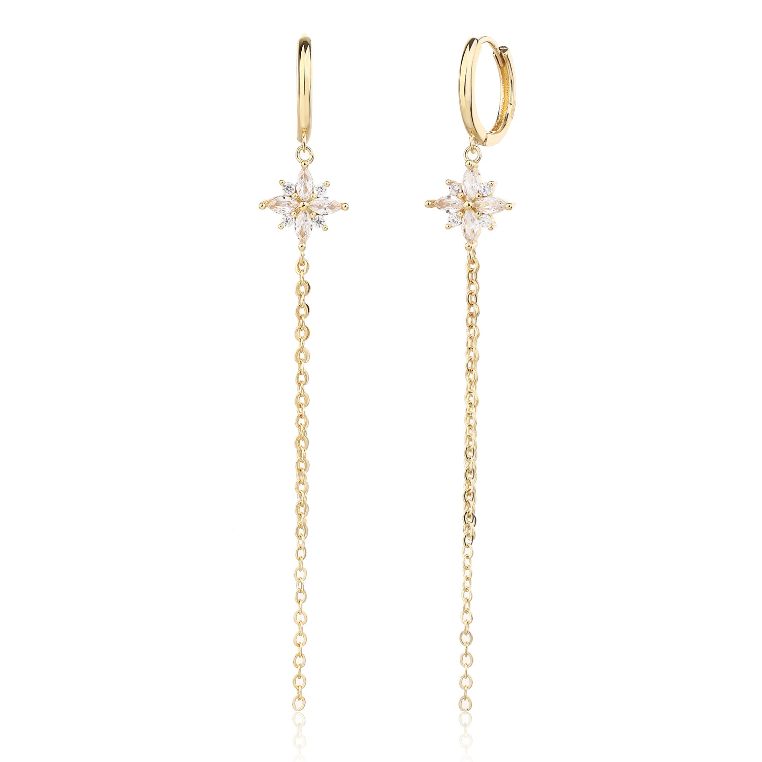 עגילי "כוכב הים" נוצרו בהשראת קסם האוקיינוס ויופיו של עולם הטבע. הם עשויים פליז בציפוי זהב 14K (2 מיקרון), משובצים בזירקונים עדינים שמנצנצים כמו אור על פני המים. התליון העליון בצורת כוכב המאיר בשמים אל מול המגדלור, מוביל לשתי שרשראות דקות ונופלות, היוצרות תנועה קלילה ואנרגיה חופשית בכל הופעה.