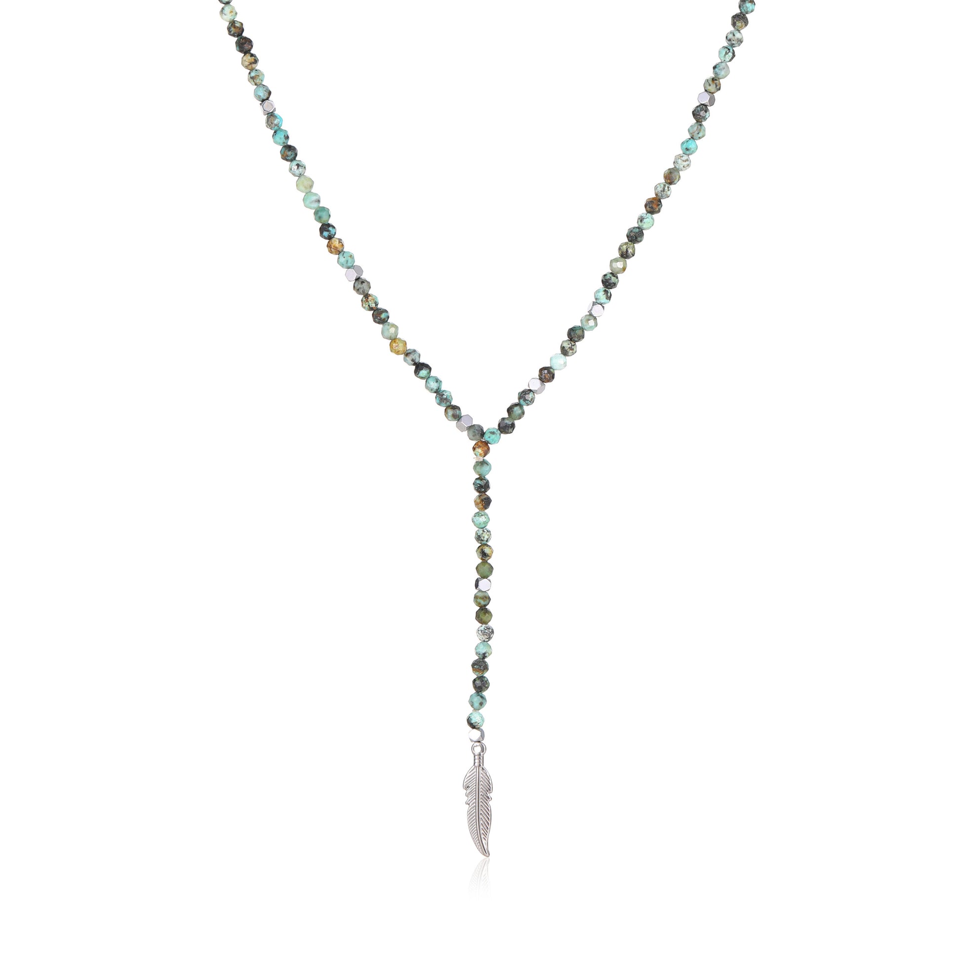 שרשרת נוצה לגבר משובצת חרוזים בצבעי אדמה ובצבעי השמי. השרשרת עשויה פלדת אל חלד. הנוצה מסמלת את העוצמה שטמונה בכל אדם. אורך השרשרת 55+10+10 ס"מ.